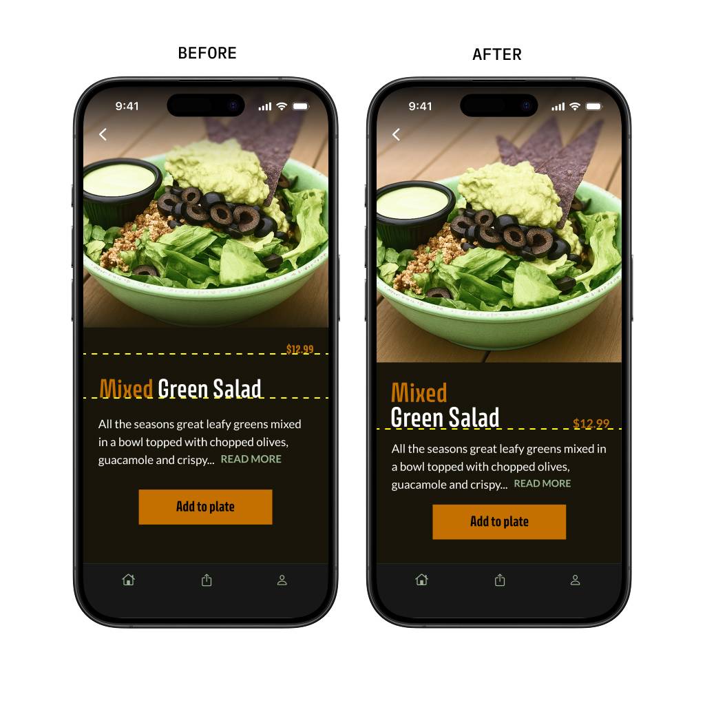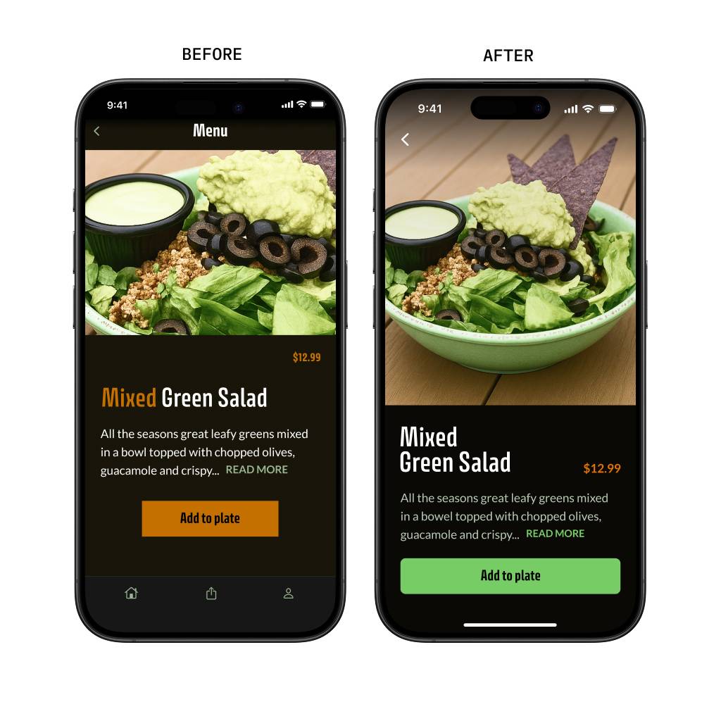 In the original, orange was doing too much. It was used for the headline, the price, and the primary CTA. These are both interactive AND read-only elements.