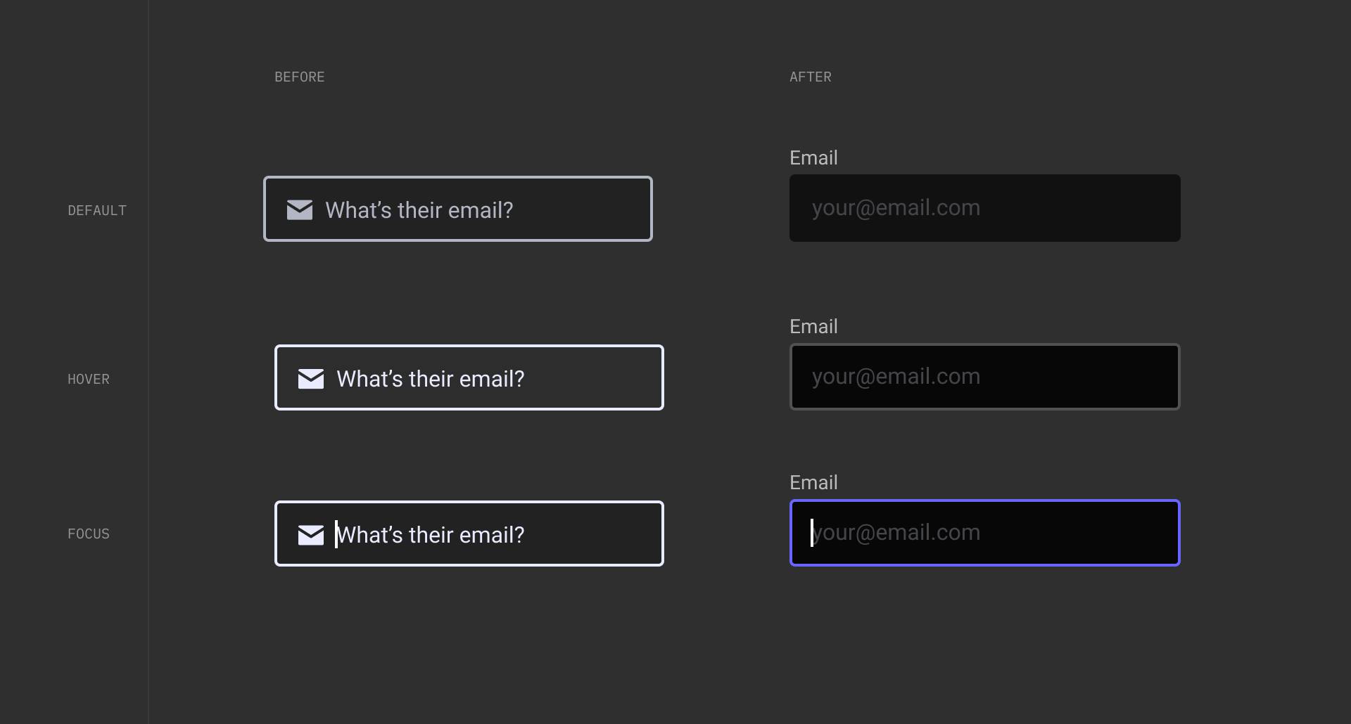 So we reset. No border on the default. A neutral baseline where nothing looks active until it really is. From there, hover gets a subtle stroke. Click brings in a purple border. Each step builds progressive clarity. Users always know where they are.