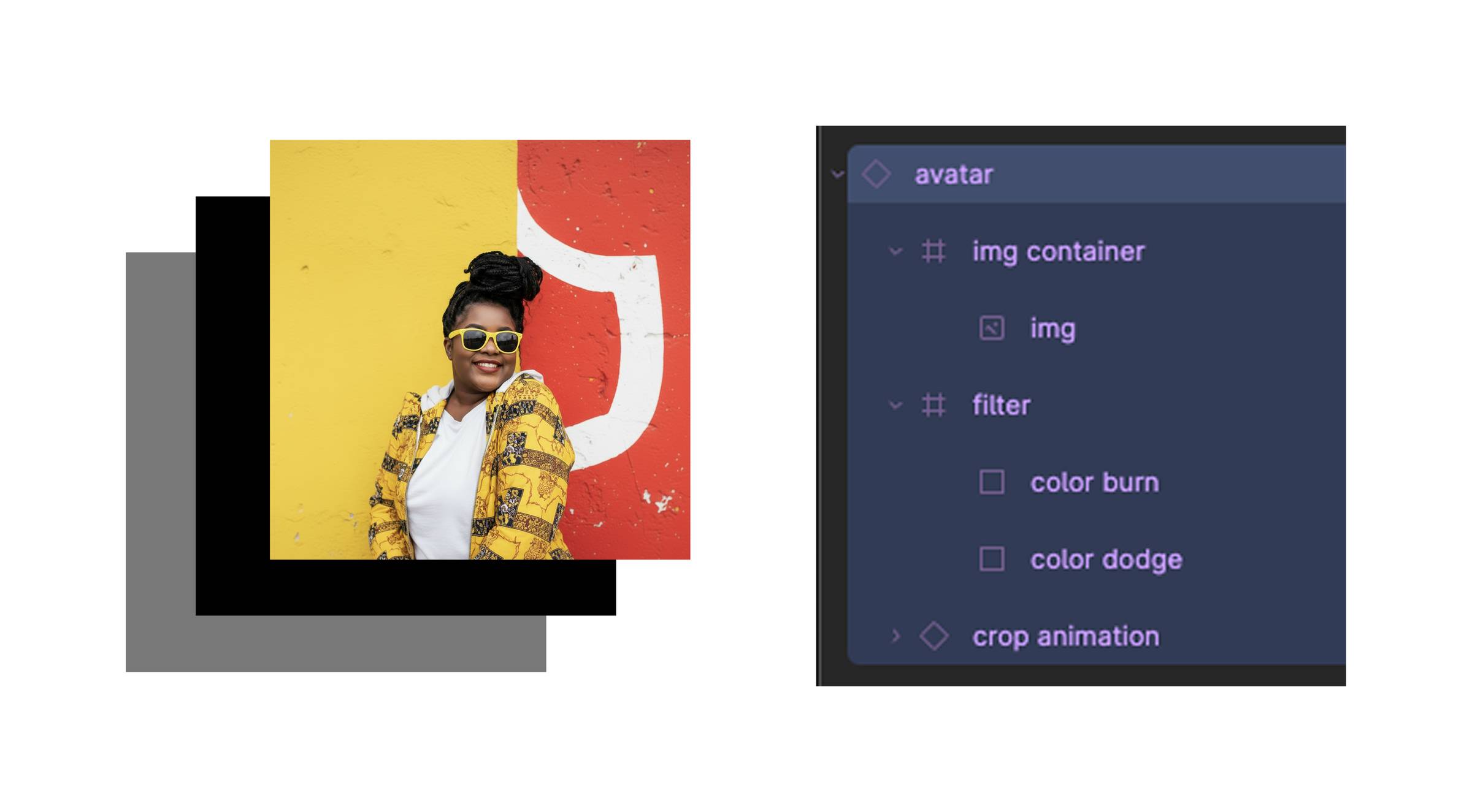 Then two blend mode layers go on top. First layer is a pure black rectangle set to color burn. Second layer underneath that is a lighter gray rectangle set to color dodge. Put both of those into a frame and that becomes your filter. For the actual image, place your photo on top of everything and set it to screen blend mode. Screen only shows the image on the black areas and lets white bleed through. So your animated blob becomes a dynamic mask.