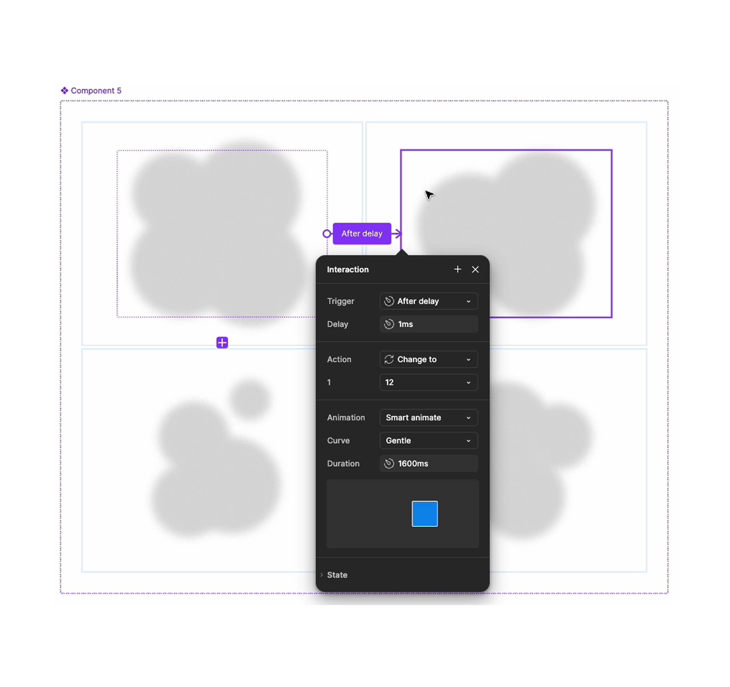 Now create variants with the circles in different positions. Make some smaller, move them around, experiment with the composition. Set up Smart Animate between variants. I used 1600 milliseconds with a gentle easing curve, but play with this. Try different curves. Maybe create custom easing. Even after it seems dialed in, it might need tweaking once it’s in code.